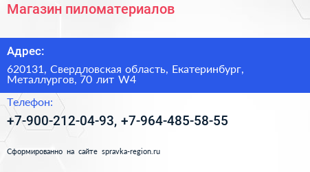Магазин пиломатериалов по адресу 620131, Свердловская область, Екатеринбург, Металлургов, 70 лит W4 в дальнейшем Организация, размещена в следующих категориях: