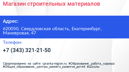 Магазин строительных материалов по адресу 620050, Свердловская область, Екатеринбург, Маневровая, 47 в дальнейшем Организация, размещена в следующих категориях: