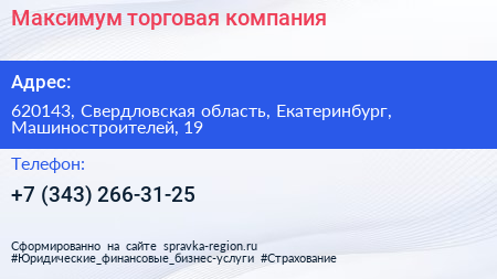 Максимум, торговая компания по адресу 620143, Свердловская область, Екатеринбург, Машиностроителей, 19 в дальнейшем Организация, размещена в следующих категориях: