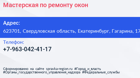 Мастерская по ремонту окон по адресу 623701, Свердловская область, Екатеринбург, Гагарина, 17 в дальнейшем Организация, размещена в следующих категориях: