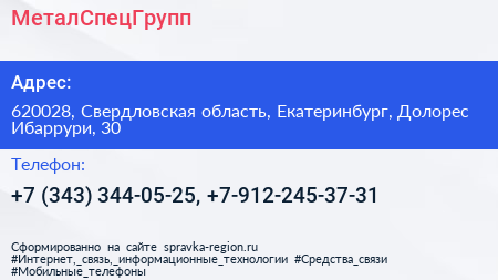 МеталСпецГрупп по адресу 620028, Свердловская область, Екатеринбург, Долорес Ибаррури, 30 в дальнейшем Организация, размещена в следующих категориях: