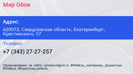 Мир Обои по адресу 620073, Свердловская область, Екатеринбург, Крестинского, 57 в дальнейшем Организация, размещена в следующих категориях: