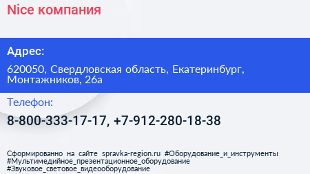 Nice, компания по адресу 620050, Свердловская область, Екатеринбург, Монтажников, 26а в дальнейшем Организация, размещена в следующих категориях:
