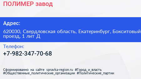 ПОЛИМЕР, завод по адресу 620030, Свердловская область, Екатеринбург, Бокситовый проезд, 1 лит Д в дальнейшем Организация, размещена в следующих категориях: