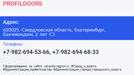 PROFILDOORS по адресу 620025, Свердловская область, Екатеринбург, Бахчиванджи, 2 лит С1 в дальнейшем Организация, размещена в следующих категориях: