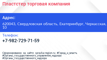 Пластстер, торговая компания по адресу 620043, Свердловская область, Екатеринбург, Черкасская, 10 в дальнейшем Организация, размещена в следующих категориях: