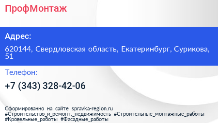 ПрофМонтаж по адресу 620144, Свердловская область, Екатеринбург, Сурикова, 51 в дальнейшем Организация, размещена в следующих категориях: