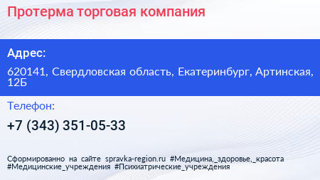 Протерма, торговая компания по адресу 620141, Свердловская область, Екатеринбург, Артинская, 12Б в дальнейшем Организация, размещена в следующих категориях: