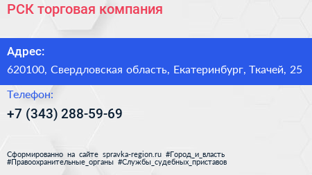 РСК, торговая компания по адресу 620100, Свердловская область, Екатеринбург, Ткачей, 25 в дальнейшем Организация, размещена в следующих категориях:
