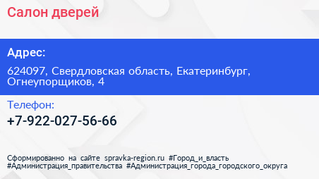 Салон дверей по адресу 624097, Свердловская область, Екатеринбург, Огнеупорщиков, 4 в дальнейшем Организация, размещена в следующих категориях: