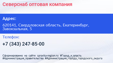 Северснаб, оптовая компания по адресу 620141, Свердловская область, Екатеринбург, Завокзальная, 5 в дальнейшем Организация, размещена в следующих категориях: