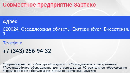 Совместное предприятие Зартекс по адресу 620024, Свердловская область, Екатеринбург, Бисертская, 1 в дальнейшем Организация, размещена в следующих категориях: