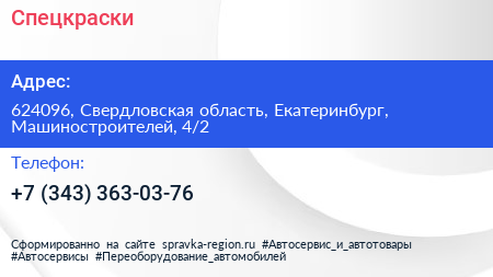 Спецкраски по адресу 624096, Свердловская область, Екатеринбург, Машиностроителей, 4/2 в дальнейшем Организация, размещена в следующих категориях: