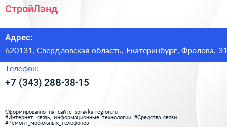 СтройЛэнд по адресу 620131, Свердловская область, Екатеринбург, Фролова, 31 в дальнейшем Организация, размещена в следующих категориях: