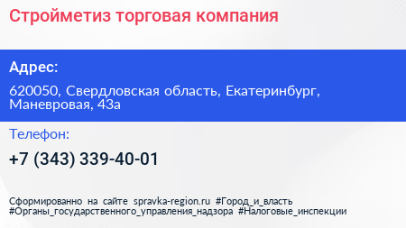 Стройметиз, торговая компания по адресу 620050, Свердловская область, Екатеринбург, Маневровая, 43а в дальнейшем Организация, размещена в следующих категориях: