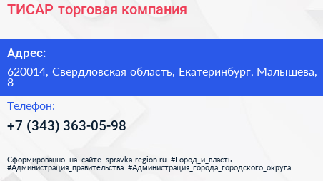 ТИСАР, торговая компания по адресу 620014, Свердловская область, Екатеринбург, Малышева, 8 в дальнейшем Организация, размещена в следующих категориях: