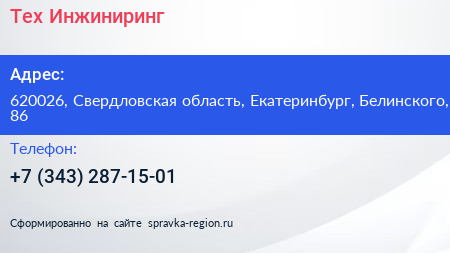 Тех Инжиниринг по адресу 620026, Свердловская область, Екатеринбург, Белинского, 86 в дальнейшем Организация, размещена в следующих категориях: