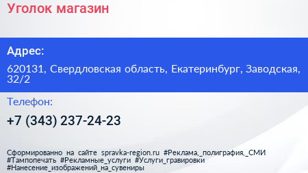 Уголок, магазин по адресу 620131, Свердловская область, Екатеринбург, Заводская, 32/2 в дальнейшем Организация, размещена в следующих категориях: