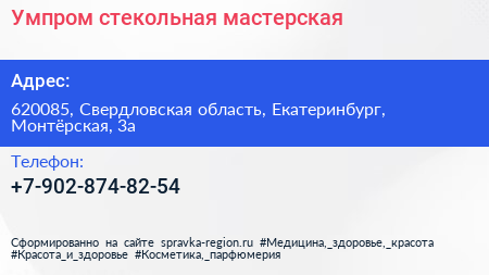 Умпром, стекольная мастерская по адресу 620085, Свердловская область, Екатеринбург, Монтёрская, 3а в дальнейшем Организация, размещена в следующих категориях: