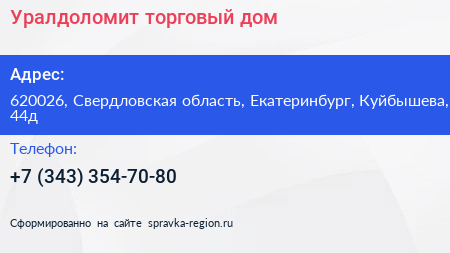 Уралдоломит, торговый дом по адресу 620026, Свердловская область, Екатеринбург, Куйбышева, 44д в дальнейшем Организация, размещена в следующих категориях: