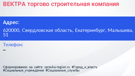 ВЕКТРА, торгово-строительная компания по адресу 620000, Свердловская область, Екатеринбург, Малышева, 51 в дальнейшем Организация, размещена в следующих категориях: