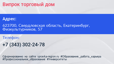 Випрок, торговый дом по адресу 623700, Свердловская область, Екатеринбург, Физкультурников, 57 в дальнейшем Организация, размещена в следующих категориях: