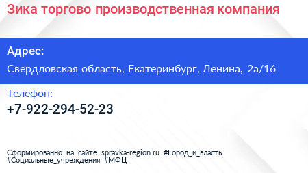 Зика, торгово-производственная компания по адресу Свердловская область, Екатеринбург, Ленина, 2а/16 в дальнейшем Организация, размещена в следующих категориях: