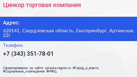 Цинкор, торговая компания по адресу 620141, Свердловская область, Екатеринбург, Артинская, 22г в дальнейшем Организация, размещена в следующих категориях: