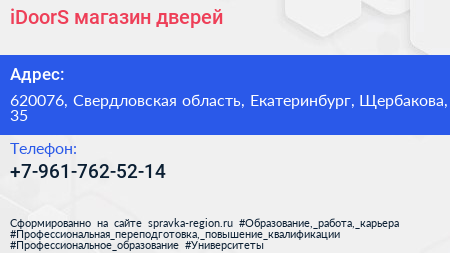 iDoorS, магазин дверей по адресу 620076, Свердловская область, Екатеринбург, Щербакова, 35 в дальнейшем Организация, размещена в следующих категориях: