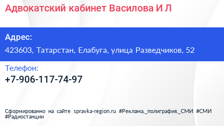Адвокатский кабинет Василова И.Л. по адресу 423603, Татарстан, Елабуга, улица Разведчиков, 52 в дальнейшем Организация, размещена в следующих категориях: