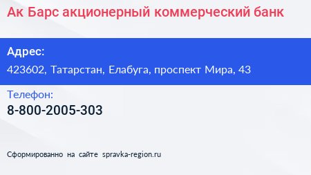 Ак Барс, акционерный коммерческий банк по адресу 423602, Татарстан, Елабуга, проспект Мира, 43 в дальнейшем Организация, размещена в следующих категориях:
