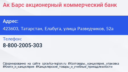 Ак Барс, акционерный коммерческий банк по адресу 423603, Татарстан, Елабуга, улица Разведчиков, 52а в дальнейшем Организация, размещена в следующих категориях: