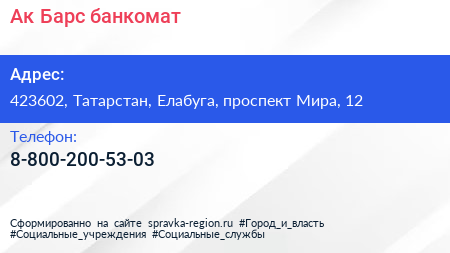 Ак Барс, банкомат по адресу 423602, Татарстан, Елабуга, проспект Мира, 12 в дальнейшем Организация, размещена в следующих категориях: