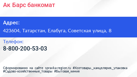 Ак Барс, банкомат по адресу 423604, Татарстан, Елабуга, Советская улица, 8 в дальнейшем Организация, размещена в следующих категориях: