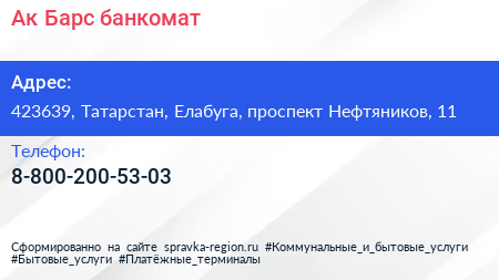 Ак Барс, банкомат по адресу 423639, Татарстан, Елабуга, проспект Нефтяников, 11 в дальнейшем Организация, размещена в следующих категориях: