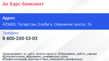 Ак Барс, банкомат по адресу 423602, Татарстан, Елабуга, Окружное шоссе, 7а в дальнейшем Организация, размещена в следующих категориях: