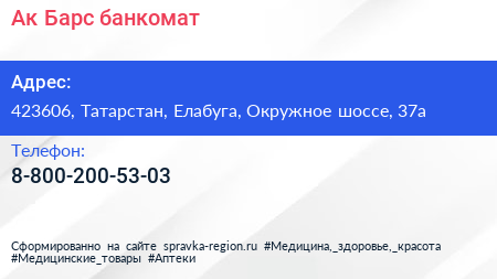 Ак Барс, банкомат по адресу 423606, Татарстан, Елабуга, Окружное шоссе, 37а в дальнейшем Организация, размещена в следующих категориях: