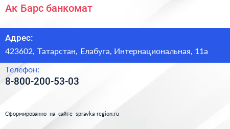 Ак Барс, банкомат по адресу 423602, Татарстан, Елабуга, Интернациональная, 11а в дальнейшем Организация, размещена в следующих категориях: