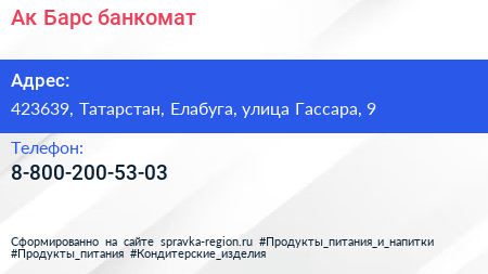 Ак Барс, банкомат по адресу 423639, Татарстан, Елабуга, улица Гассара, 9 в дальнейшем Организация, размещена в следующих категориях: