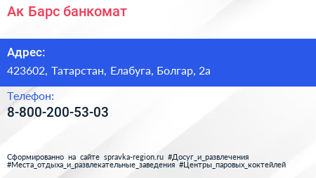 Ак Барс, банкомат по адресу 423602, Татарстан, Елабуга, Болгар, 2а в дальнейшем Организация, размещена в следующих категориях: