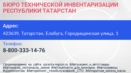 БЮРО ТЕХНИЧЕСКОЙ ИНВЕНТАРИЗАЦИИ РЕСПУБЛИКИ ТАТАРСТАН по адресу 423639, Татарстан, Елабуга, Городищенская улица, 1 в дальнейшем Организация, размещена в следующих категориях: