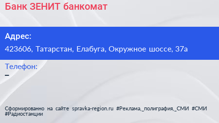 Банк ЗЕНИТ, банкомат по адресу 423606, Татарстан, Елабуга, Окружное шоссе, 37а в дальнейшем Организация, размещена в следующих категориях: