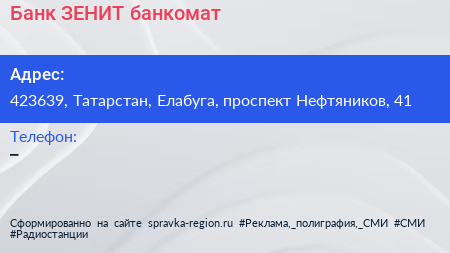 Банк ЗЕНИТ, банкомат по адресу 423639, Татарстан, Елабуга, проспект Нефтяников, 41 в дальнейшем Организация, размещена в следующих категориях: