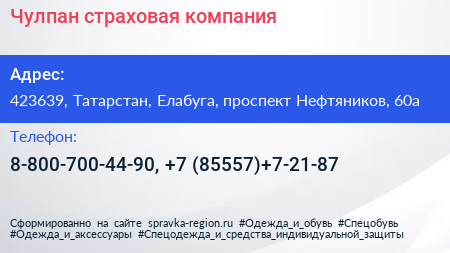 Чулпан, страховая компания по адресу 423639, Татарстан, Елабуга, проспект Нефтяников, 60а в дальнейшем Организация, размещена в следующих категориях: