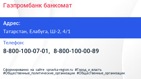 Газпромбанк, банкомат по адресу Татарстан, Елабуга, Ш-2, 4/1 в дальнейшем Организация, размещена в следующих категориях: