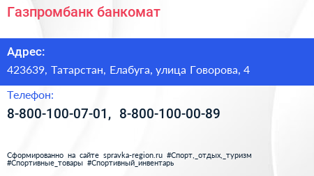 Газпромбанк, банкомат по адресу 423639, Татарстан, Елабуга, улица Говорова, 4 в дальнейшем Организация, размещена в следующих категориях: