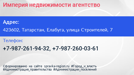 Империя недвижимости, агентство по адресу 423602, Татарстан, Елабуга, улица Строителей, 7 в дальнейшем Организация, размещена в следующих категориях: