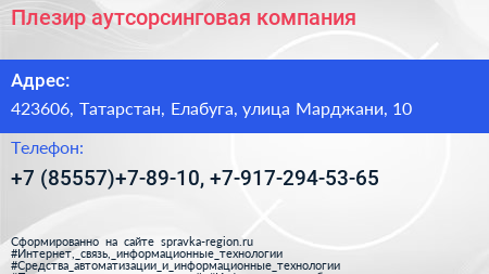 Плезир, аутсорсинговая компания по адресу 423606, Татарстан, Елабуга, улица Марджани, 10 в дальнейшем Организация, размещена в следующих категориях: