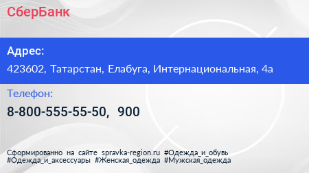 СберБанк по адресу 423602, Татарстан, Елабуга, Интернациональная, 4а в дальнейшем Организация, размещена в следующих категориях: