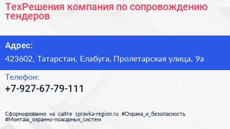 ТехРешения, компания по сопровождению тендеров по адресу 423602, Татарстан, Елабуга, Пролетарская улица, 9а в дальнейшем Организация, размещена в следующих категориях: